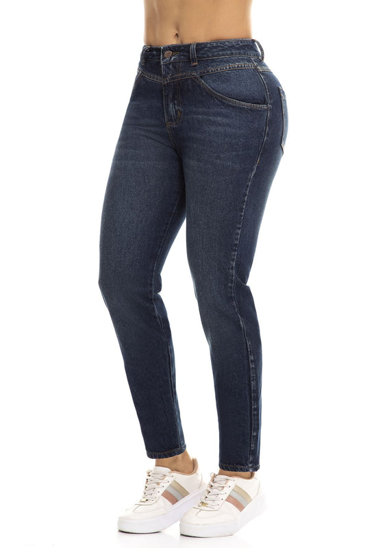 10103 Pantalón Mom fit, tiro alto, 100% algodón tono azul oscuro