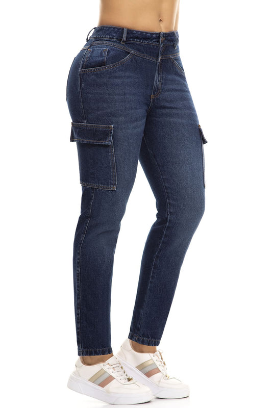 10099 Pantalón Cargo, tiro alto, 100% algodón tono azul oscuro