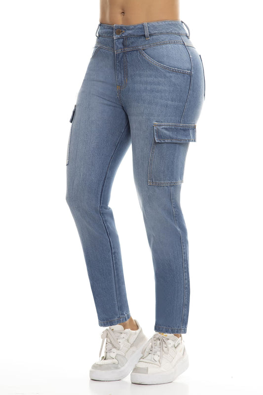 10100 Pantalón Cargo, tiro alto, 100% algodón tono azul medio
