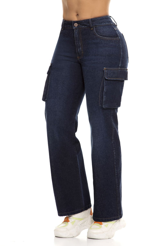 10095 Pantalón Cargo bota ancha, tiro alto, 100% algodón tono azul oscuro