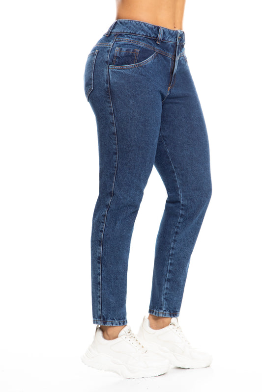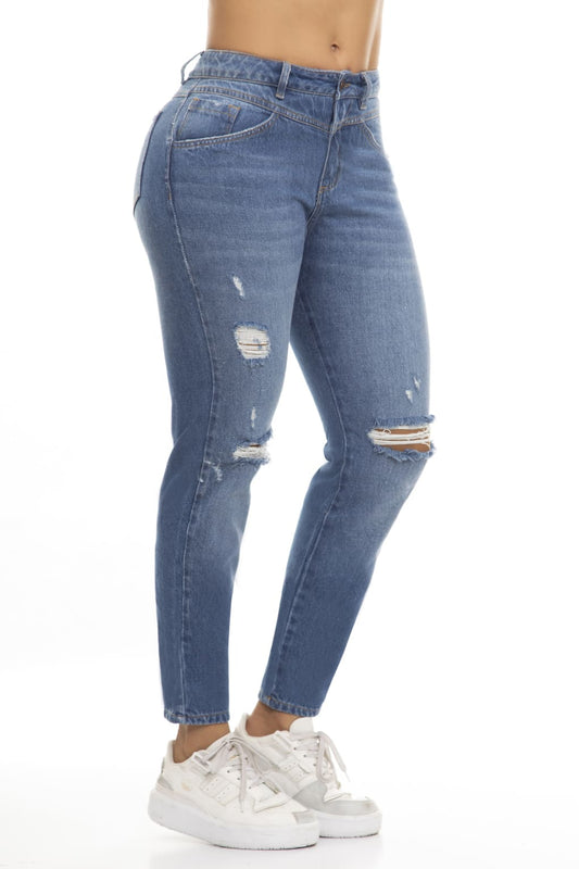 Ref. 10059 Jean Strech ,tiro súper alto, efecto push up, tono azul medio con rotos