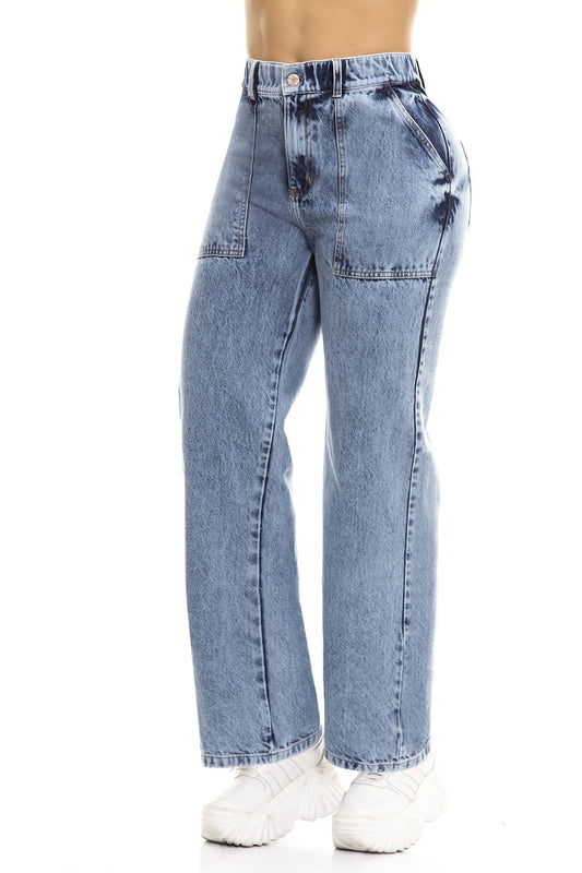 10111 Pantalón Mom fit, tiro alto, 100% algodón tono azul medio