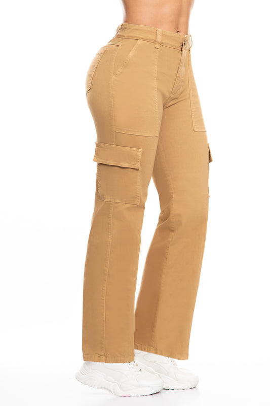 10107 Pantalón Cargo bota ancha, tiro súper alto, color terracota, strech.