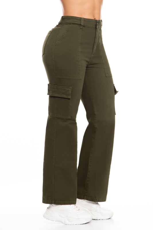 10109 pantalón cargo, tiro súper alto, bota ancha, tono verde militar
