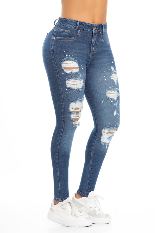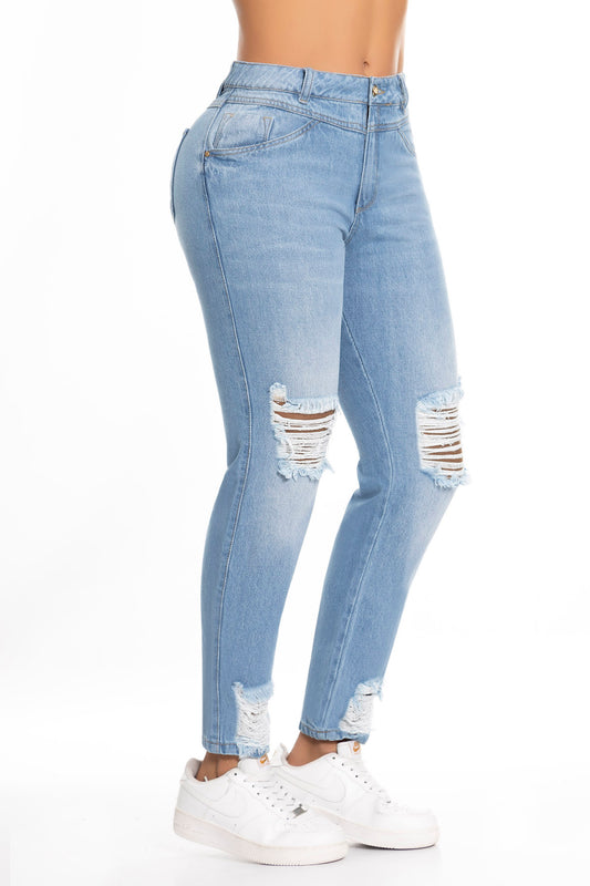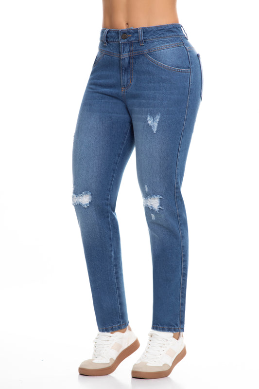 Ref. 10059 Jean Strech ,tiro súper alto, efecto push up, tono azul medio con rotos