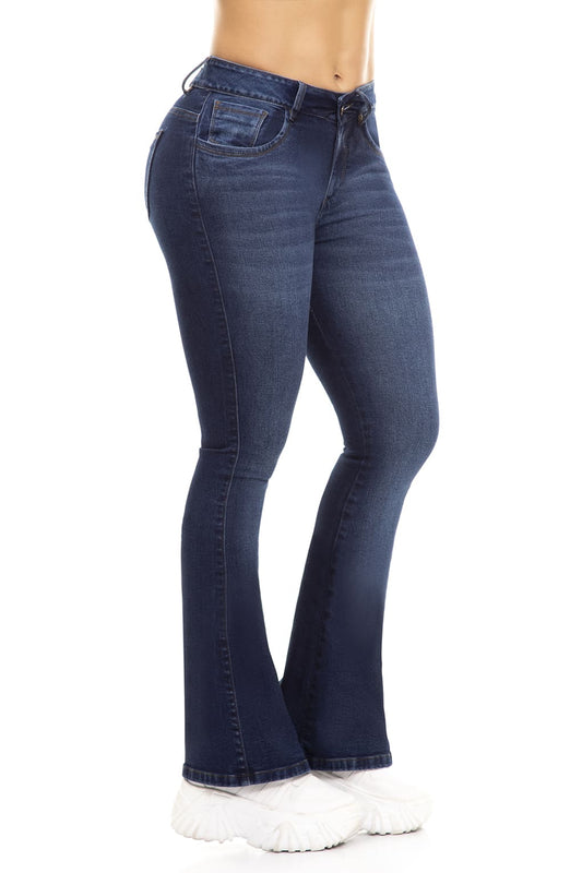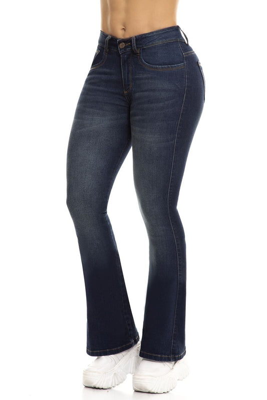 10106 Pantalón Flare bota ancha, stretch, tiro alto, tono azul medio