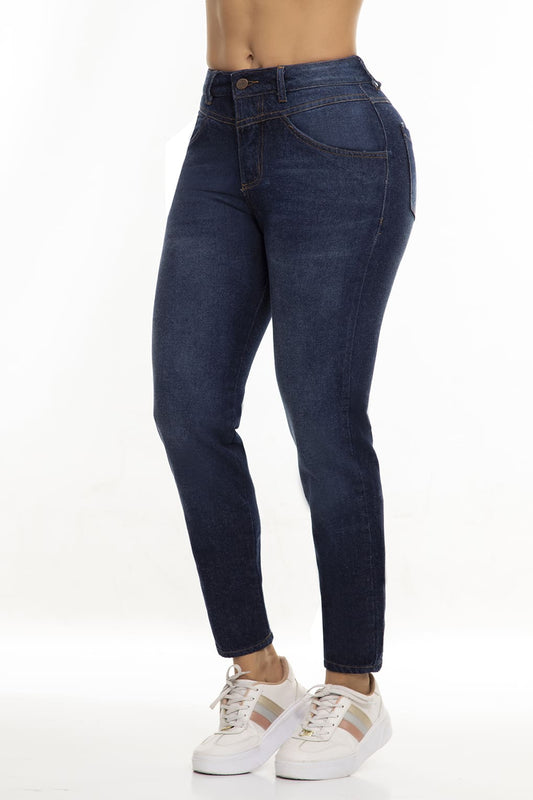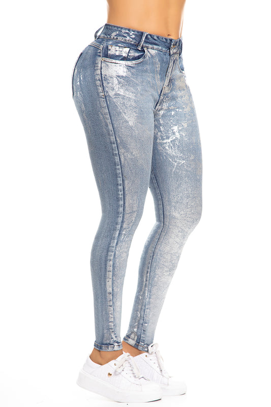 Ref. 10057 Jean Strech ,tiro súper alto, efecto push up, tono azul con satinados